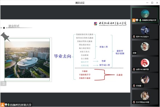 会议开始讲解了每届毕业人数上升,新冠对就业形势的影响,整体经济市场环境的影响,以及毕业之后的去向和多种选择。对同学们可能存在的问题进行了罗列总结。对就业的同学进行的建议和找工作实习的注意事项进行详细分析,对考研的同学进行了形势的分析、往届考研的经验案例分享、考研院校的选择注意事项。让同学们自己做分析和面临的选择,让同学们有多种准备应对当前形势的改变。