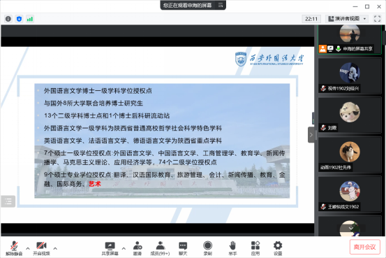 此次会议申海老师介绍了西安外国大学研究生的招生简章和招生信息,欢迎同学们报考西安外国语大学,对考研的优点和弊端进行了分析罗列了四个优点和三个弊端帮助同学们更准确的做出考研的判断,更加有效的选择院校,更加了解考研,并对考研调剂的相关问题进行了详细解说,之后关于同学们提出的问题进行了解答,关于考研的相关问题进行分析,让同学们更能了解当前形势把握机会考研更加顺利。