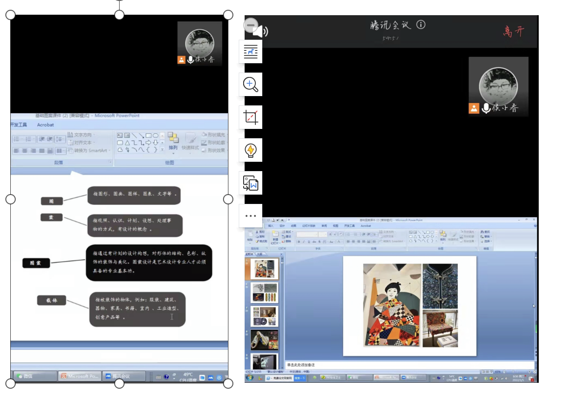 我的本科课程是图案基础,这门课程是我们视觉传达设计专业的必修课程,按照教学计划,本周是大一学生第一次上课,我首先让班长给班级微信群发送了此次课程所用教材的电子书,让同学们提前预习,提前了解课程第一部分所学的基本内容并准备讨论问题。课堂上我采用腾讯会议的形式在第一时段通过共享屏幕给学生讲解此次课程教学目的,旨在让学生学习了解我国优秀的传统图案和民间图案,增强学生的文化自信,课程讲授过程中我鼓励大家参观本市及周边的博物馆,直观接受传统文化的熏染,同学们也很有热情纷纷留言表示疫情解封后会尽快去学习和感受。第二时段是通过共享屏幕给学生们分享国内知名设计师运用中华传统纹样设计的经典案例视频,在分析和讨论过程中学生们对课程的学习产生了更为浓厚的学习兴趣。