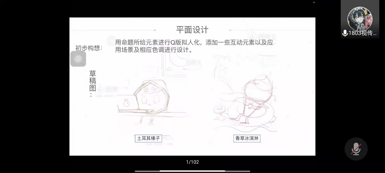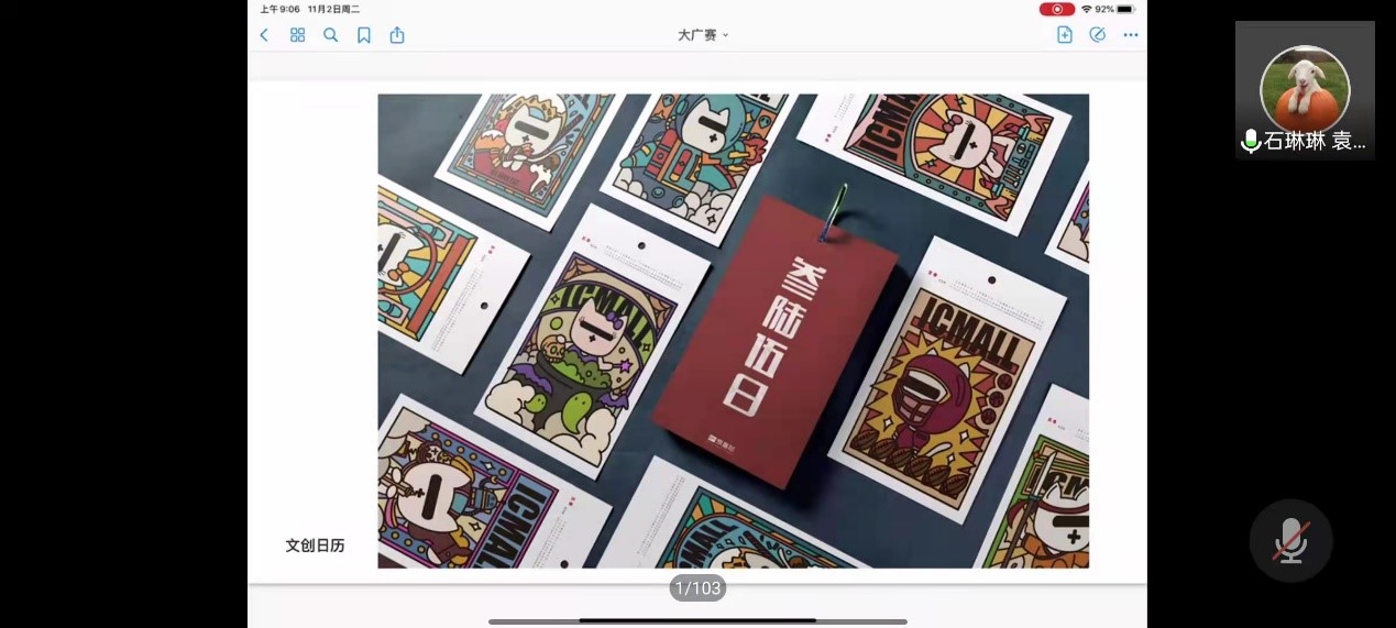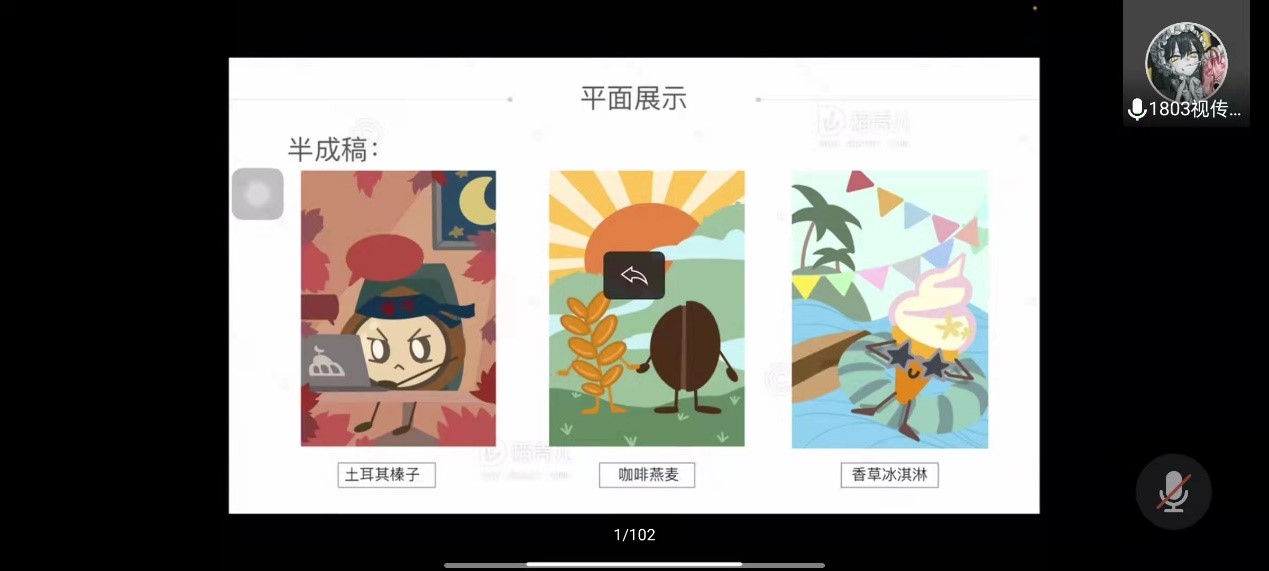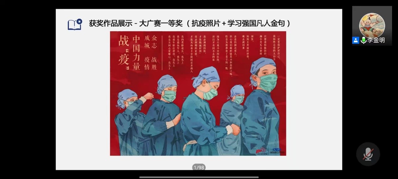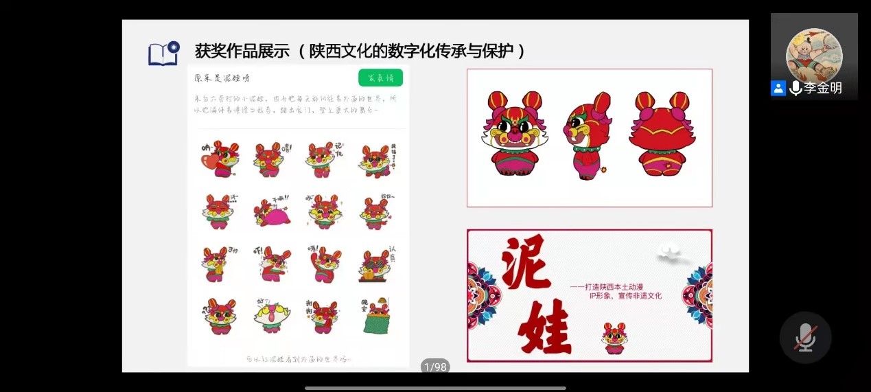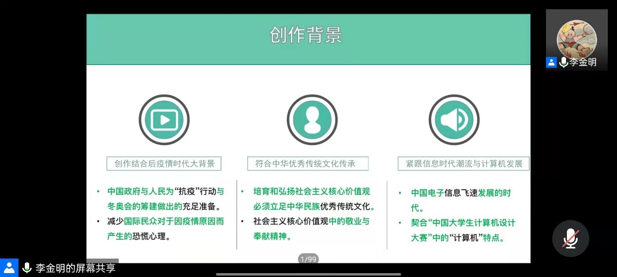 李金明老师展示了接下来获奖同学的作品,之后由获奖同学2019级动画专业马萨、董何锦春、杨依璇、张炳权和2019级戏文专业的赵佳智分享作品获奖心得体会和参赛经验,之后由王元方老师进行总结。