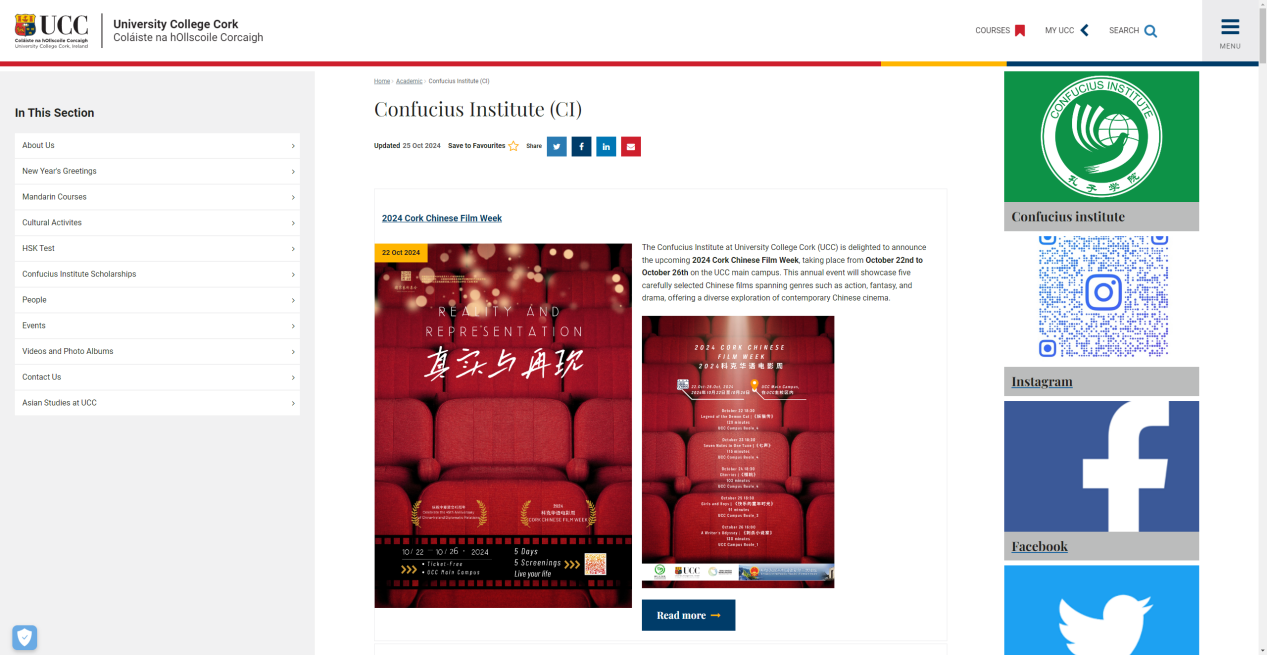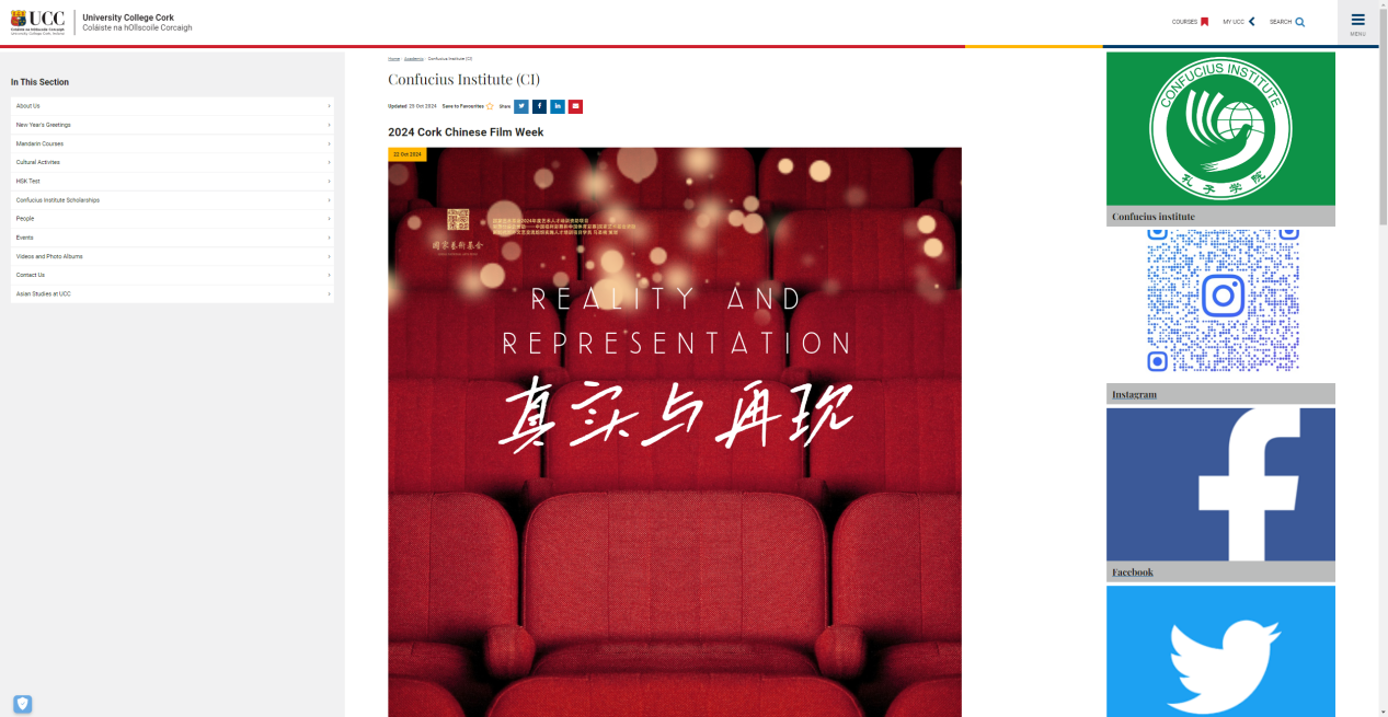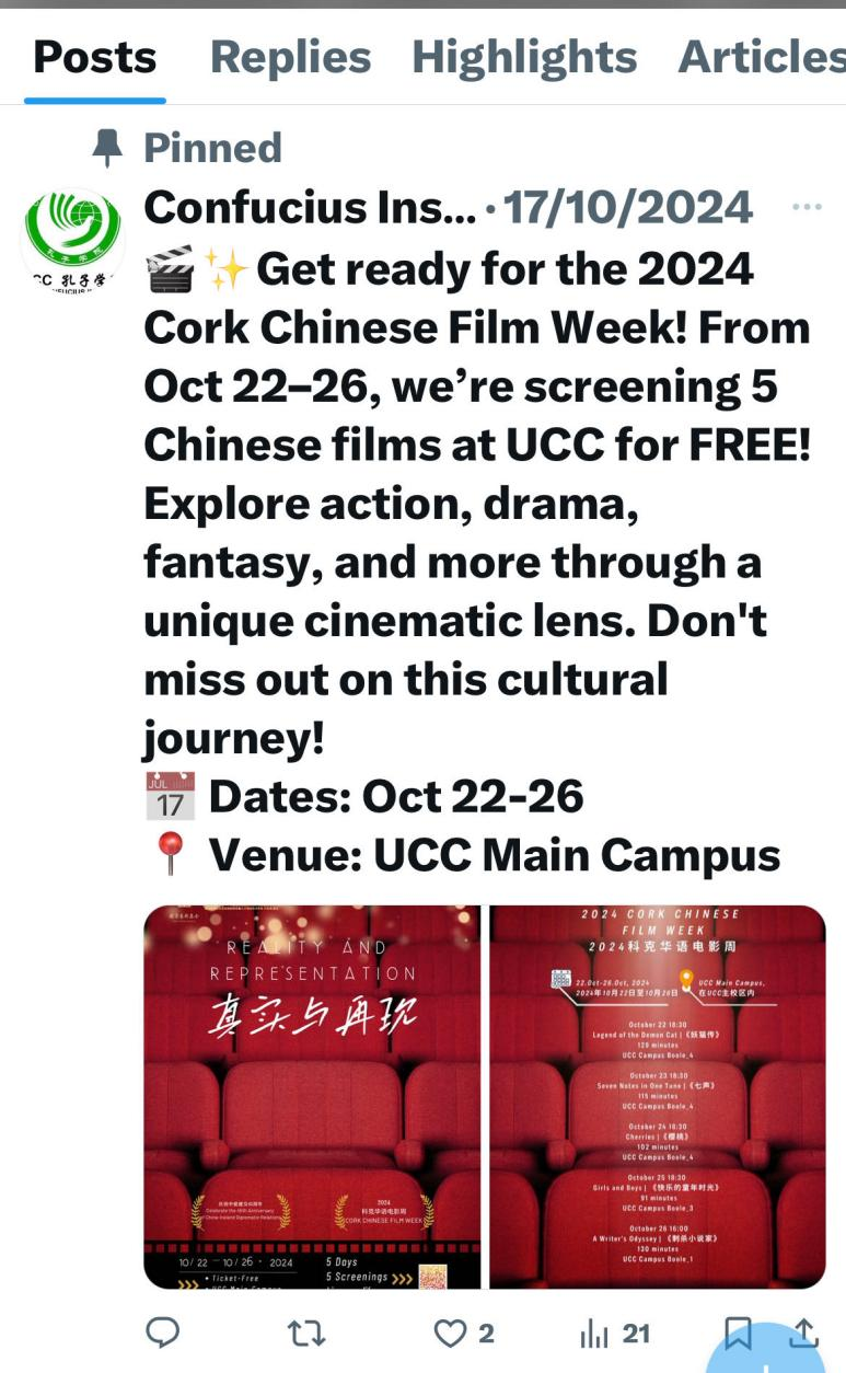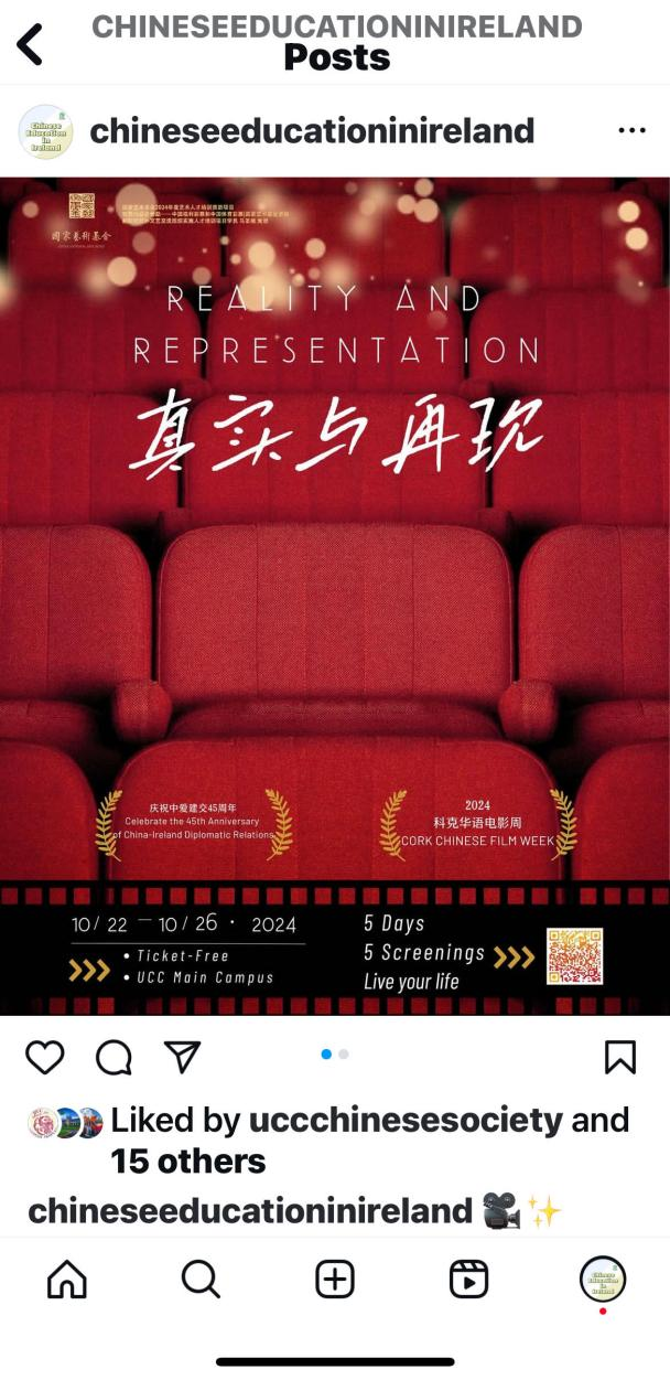 影展活动在科克大学孔子学院官网以及Facebook、推特、Instagram等信息平台得到推介和宣传。