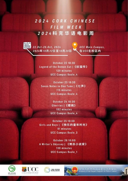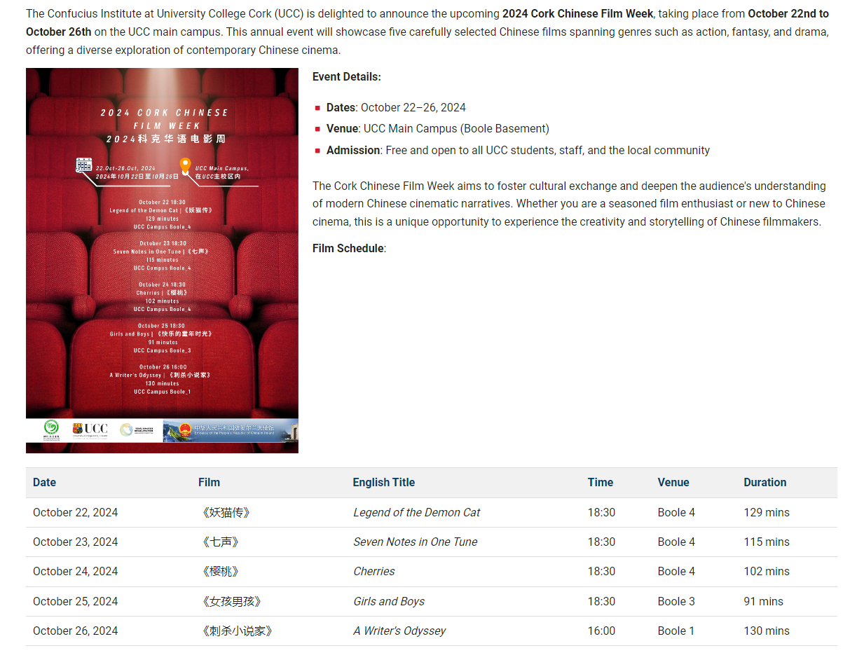 由中国驻爱尔兰大使馆与国家艺术基金“新时代对外文艺交流组织实施人才培训”项目指导、爱尔兰科克大学与科克大学孔子学院共同主办、项目学员马圣楠策划的2024年科克华语电影周影展活动即将开启。此次电影周影展活动的举办正值中爱两国建交45周年,通过系列精彩影片的放映,旨在促进两国文艺深入交流与理解。通过电影这一艺术形式,以期为观众呈现一个既古老又充满活力的中国形象,展现当代中国多元、包容与开放的社会图景。
