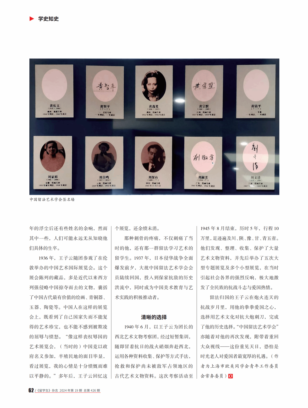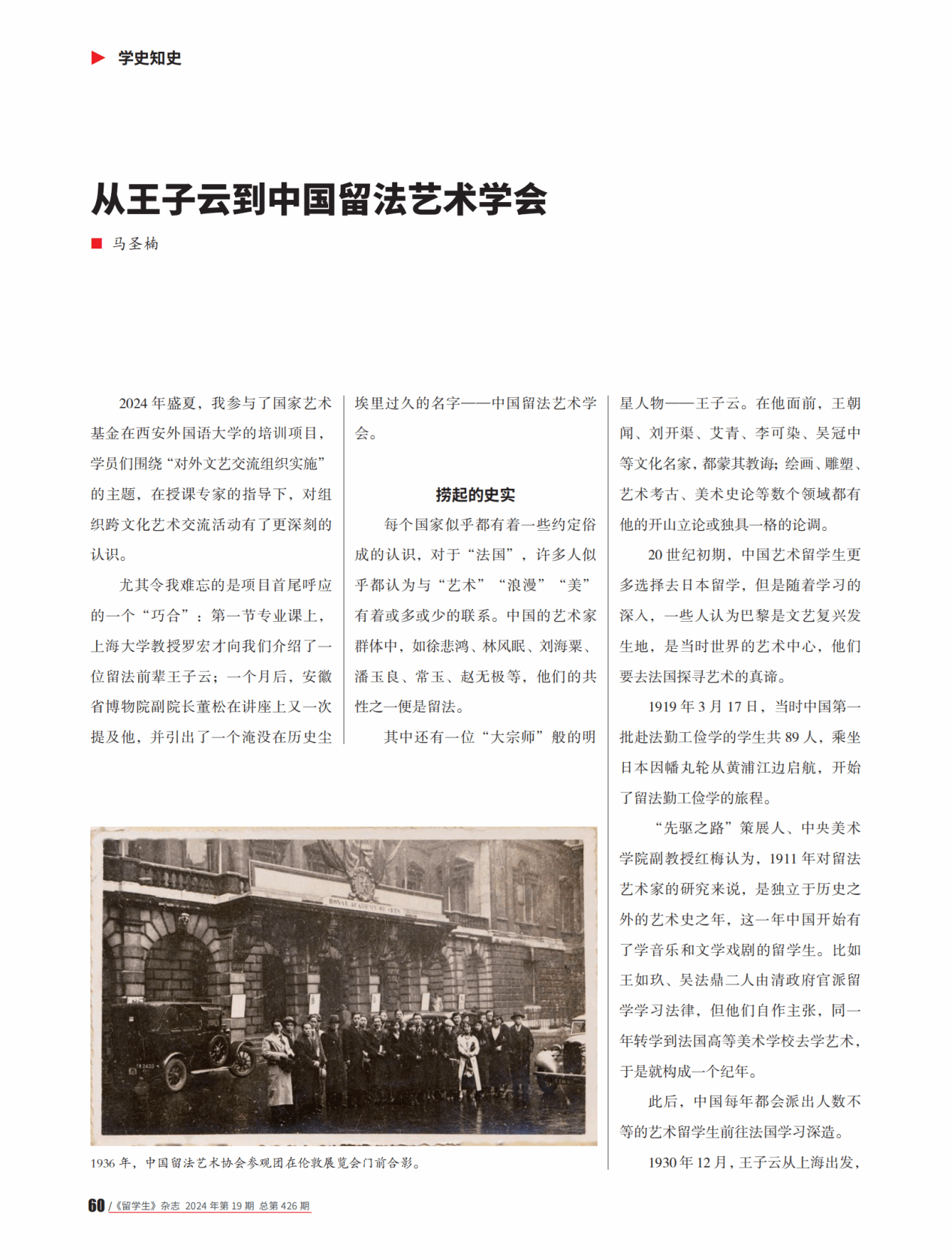 国家艺术基金学员马圣楠,在欧美同学会(中国留学人员联谊会)主办、中央统战部主管的《留学生》杂志上发表了一篇题为《从王子云到中国留法艺术学会》的文章,该文刊载于2024年第19期,总第426期。